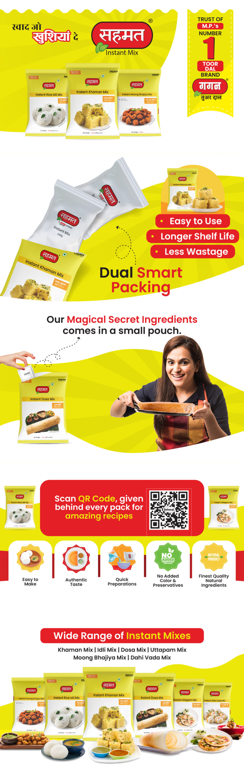 A modern and refreshing brand identity designed for a range of instant food mixes. The visual style reflects purity, freshness, and everyday convenience while keeping an authentic Indian touch. The packaging combines clean typography with natural colors to highlight the brand’s focus on taste, trust, and quality.